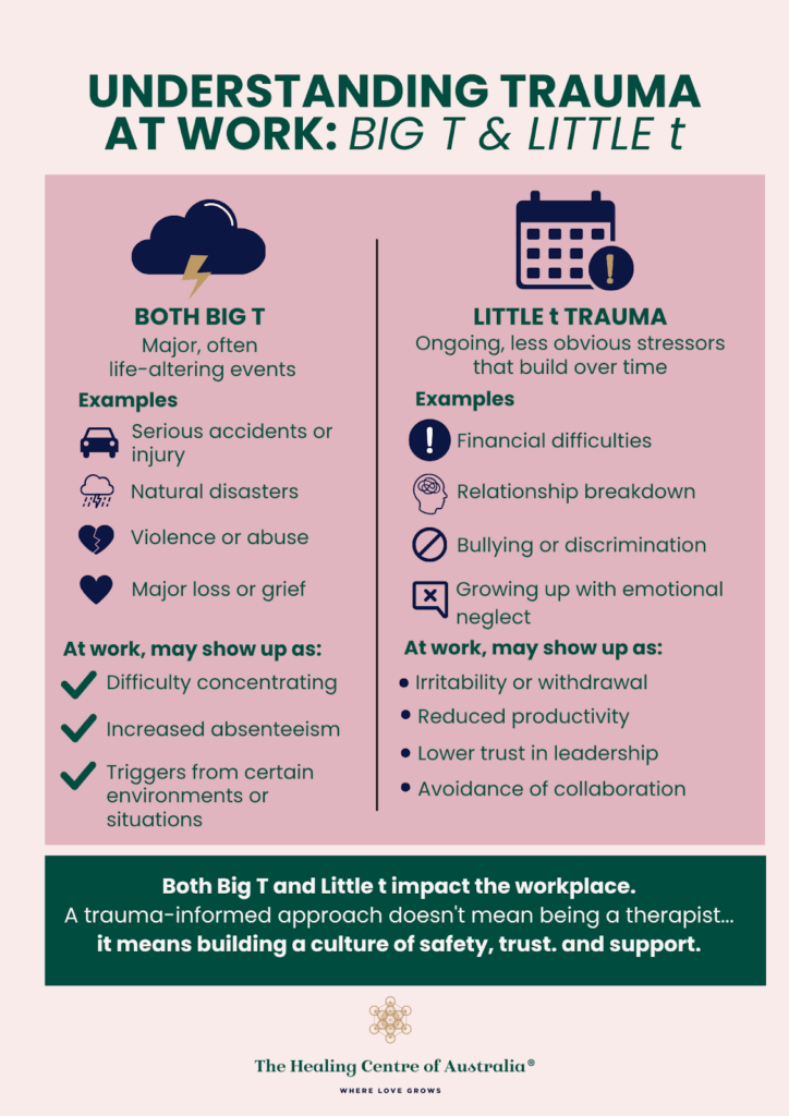 While Big T can be more noticeable, “little t” events can erode wellbeing over time. People may bring both kinds of trauma into work. Recognising that trauma isn’t always a single dramatic event helps remove stigma and opens the space for more empathetic responses.