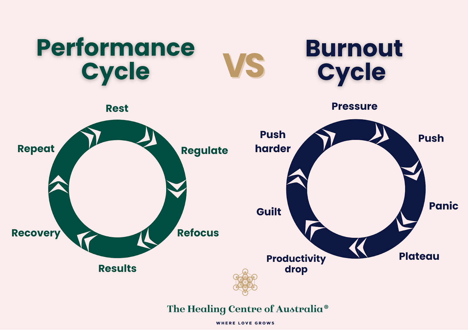 Burnout Cycle: Pressure → Push → Panic → Plateau → Productivity drop → Guilt → Push harder